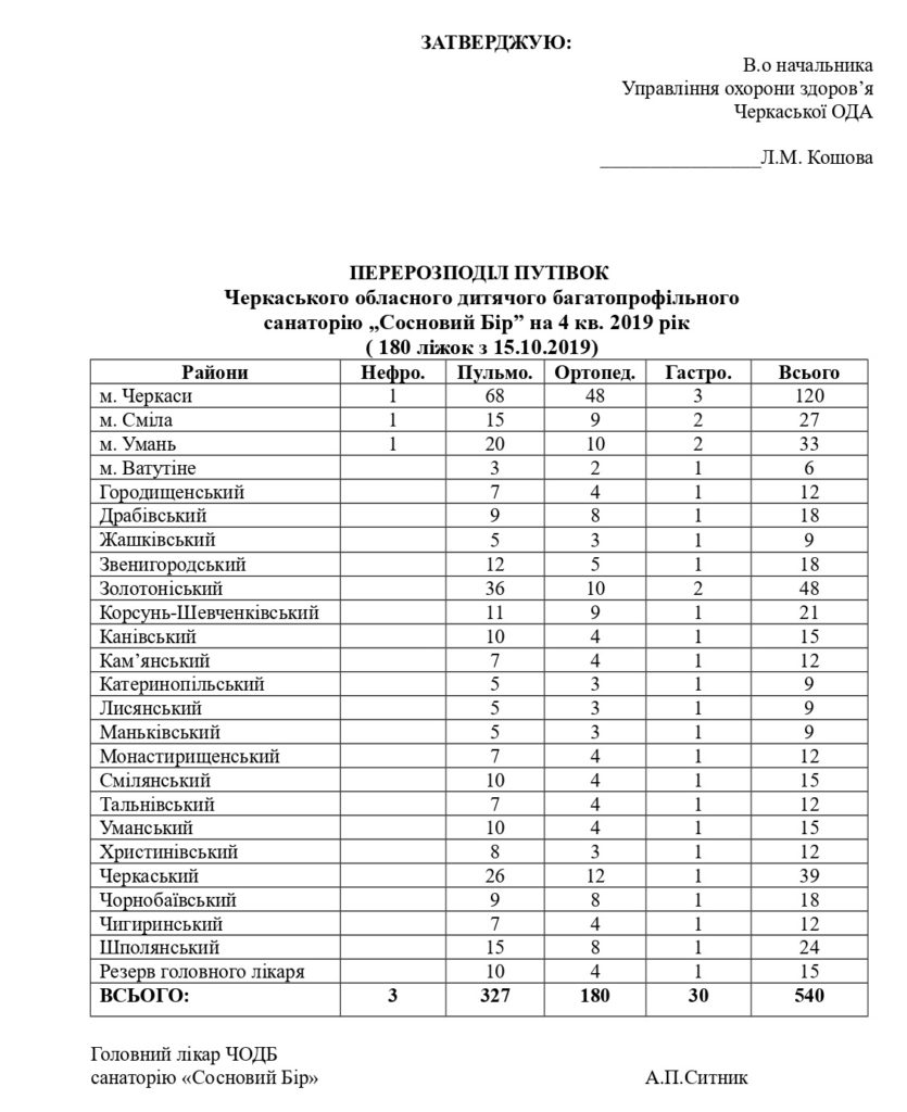 ПЕРЕРОЗПОДІЛ ПУТІВОК Черкаського обласного дитячого багатопрофільного санаторію „Сосновий Бір” на 4 кв. 2019 рік 25.10.2019 | Коментарів немає